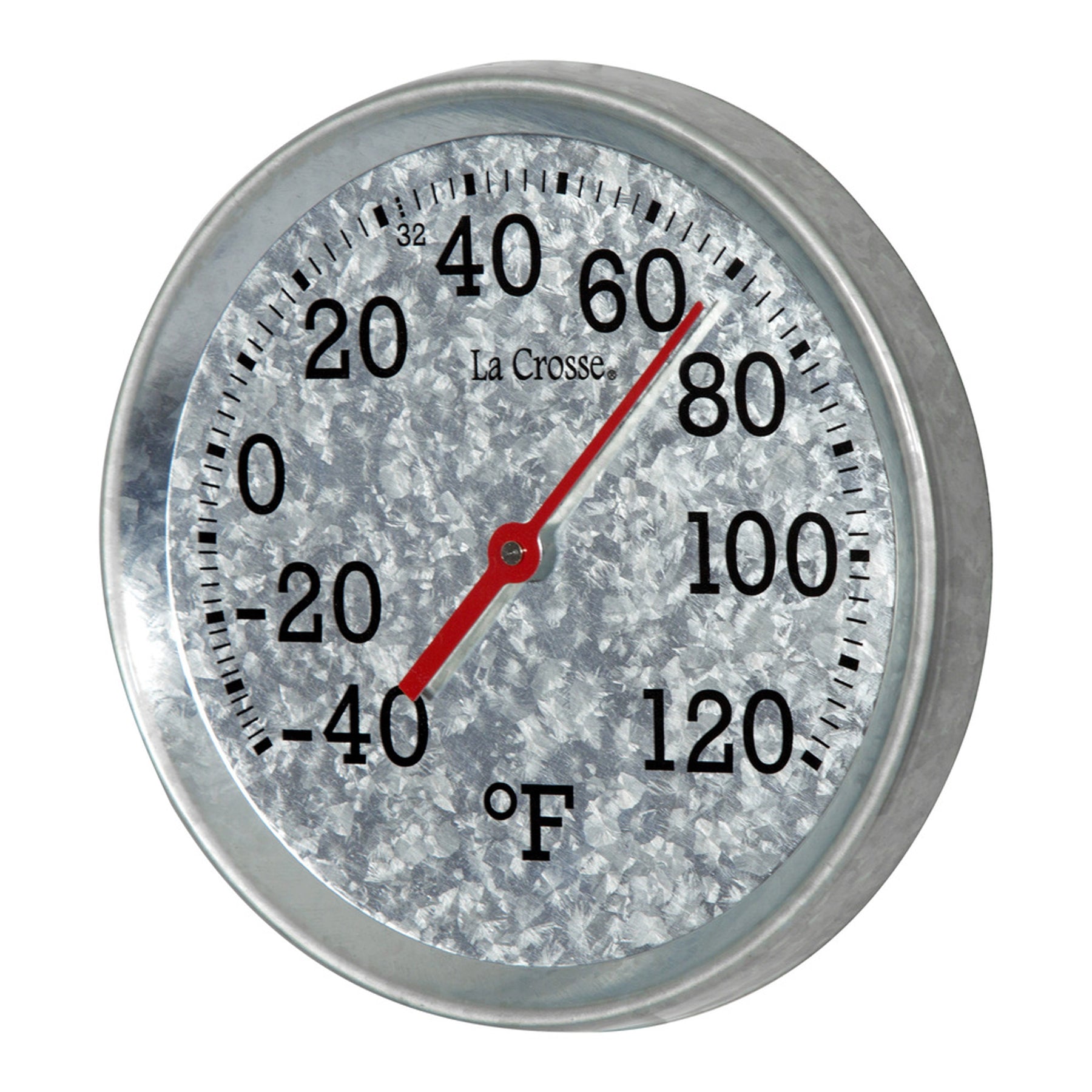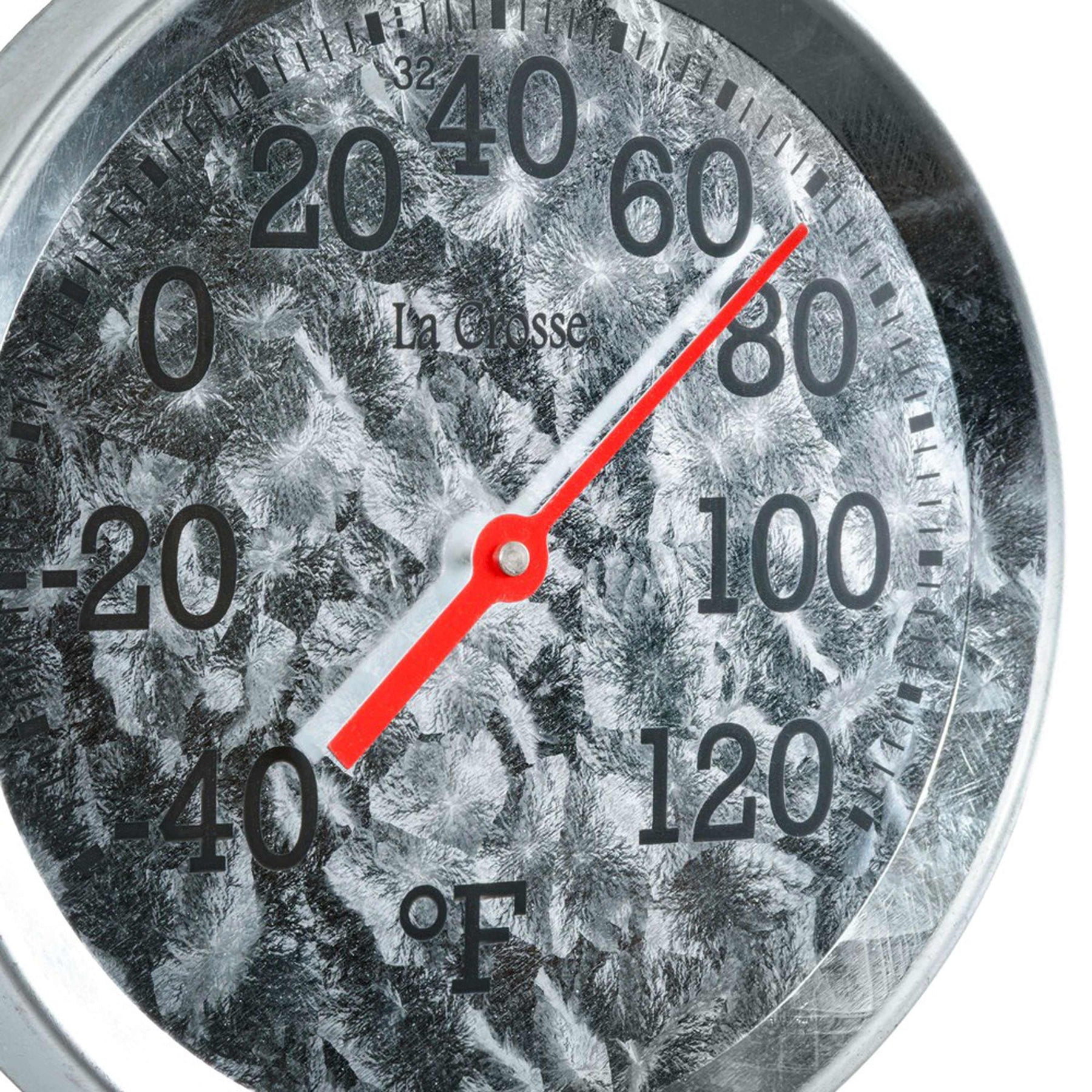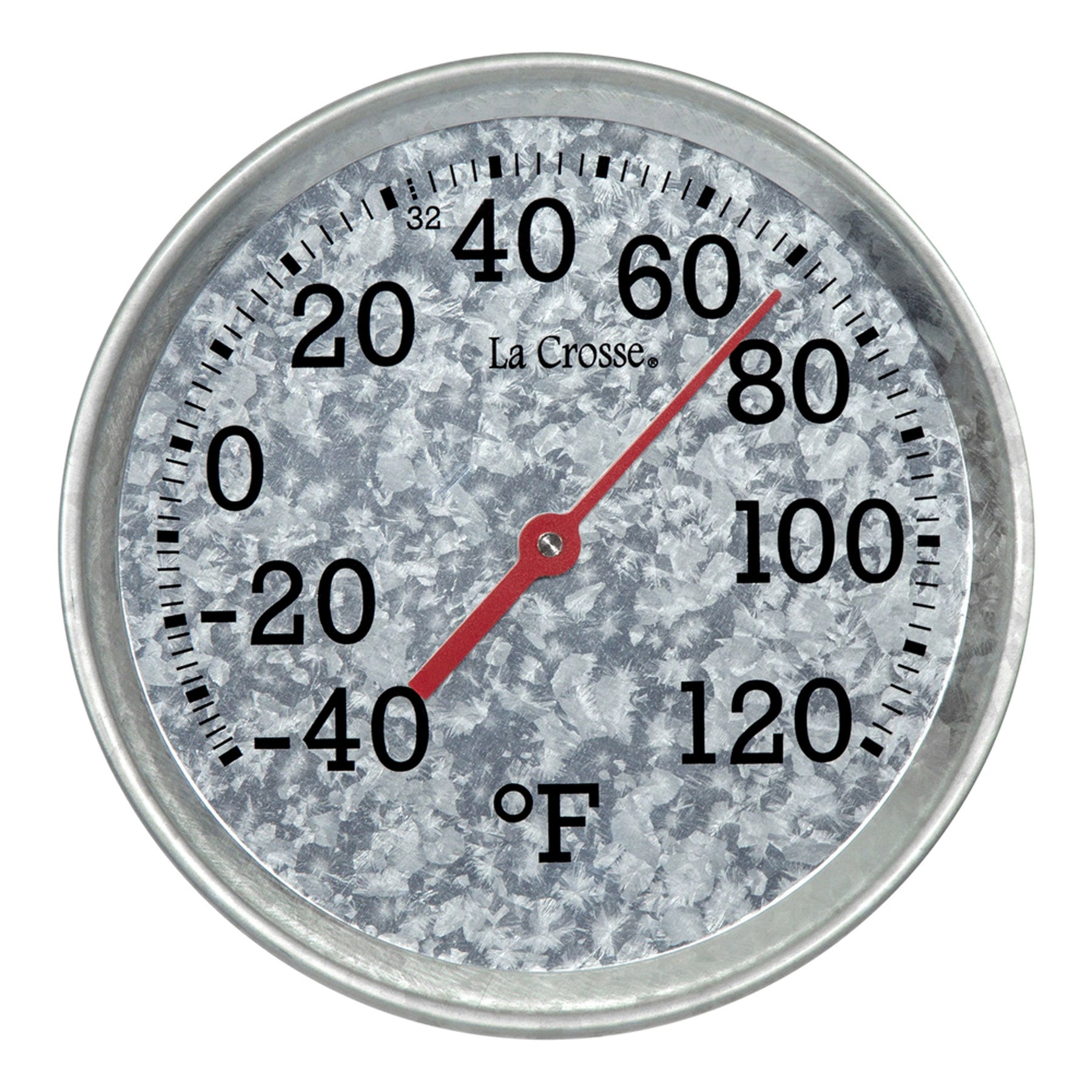 Close-up image of the dial and frame of the 104-2822 8-inch Galvanized Dial Thermometer, galvanized metal dial with black number markings and a red pointer with a temperature scale from -40 to 120 degrees Fahrenheit