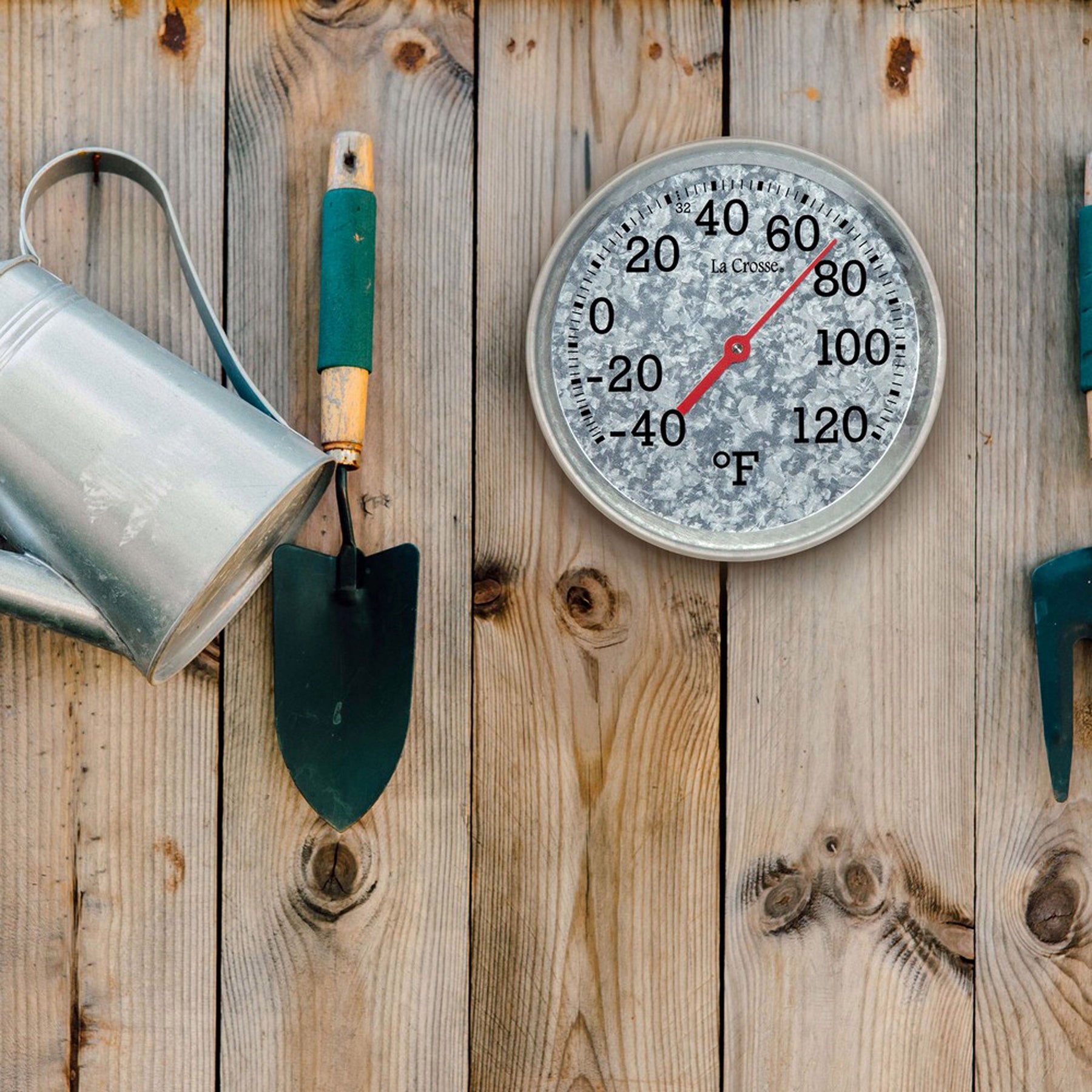 Lifestyle image of the 104-2822 8-inch Galvanized Dial Thermometer, galvanized metal dial with black number markings and a red pointer with a temperature scale from -40 to 120 degrees Fahrenheit hanging on a wood fence with garden tools