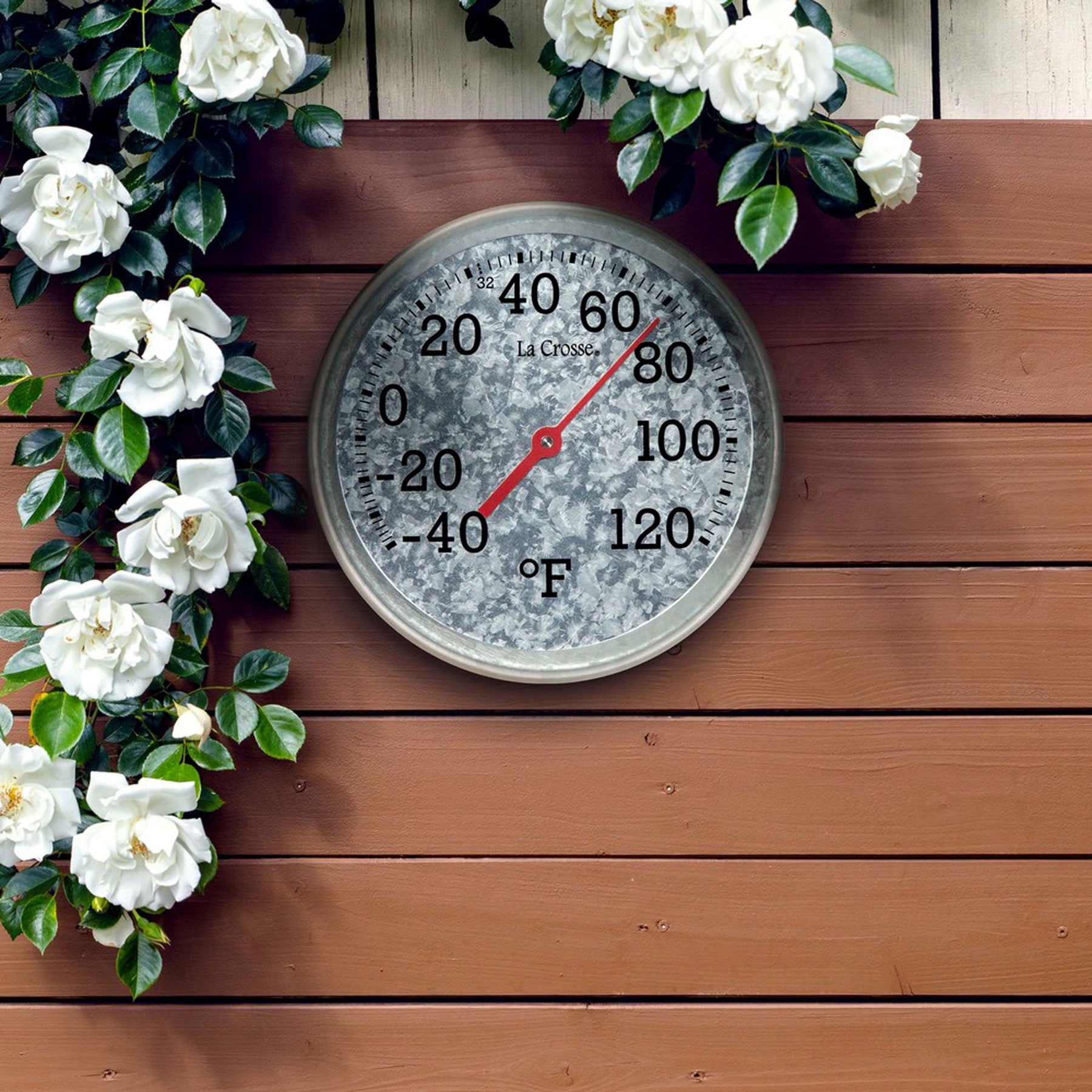 104-2822 8-inch Galvanized Dial Thermometer, galvanized metal dial with black number markings and a red pointer with a temperature scale from -40 to 120 degrees Fahrenheit, hanging on a brown painted fence with a white flower vine