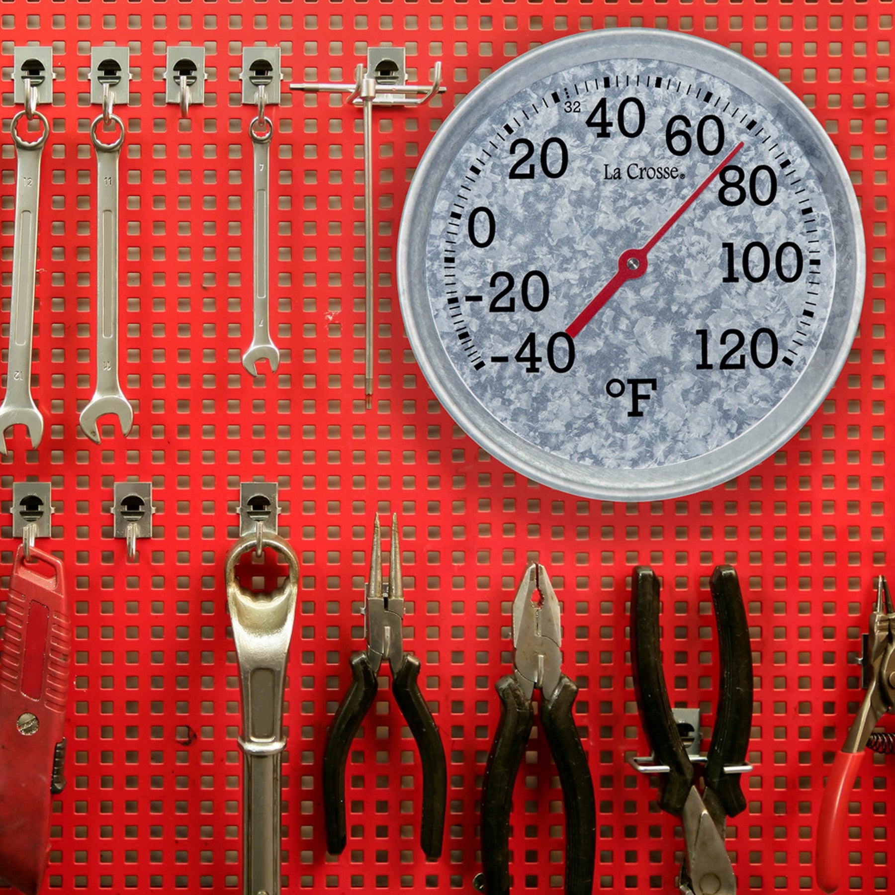 104-2822 8-inch Galvanized Dial Thermometer, galvanized metal dial with black number markings and a red pointer with a temperature scale from -40 to 120 degrees Fahrenheit hanging on a red pegboard wall with tools