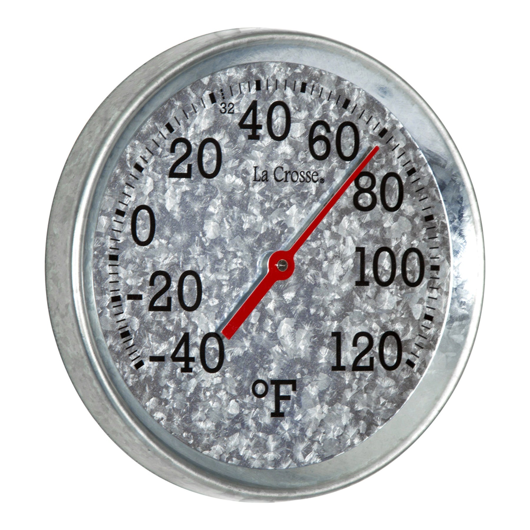 Head-on image of the 104-2822 8-inch Galvanized Dial Thermometer, galvanized metal dial with black number markings and a red pointer with a temperature scale from -40 to 120 degrees Fahrenheit