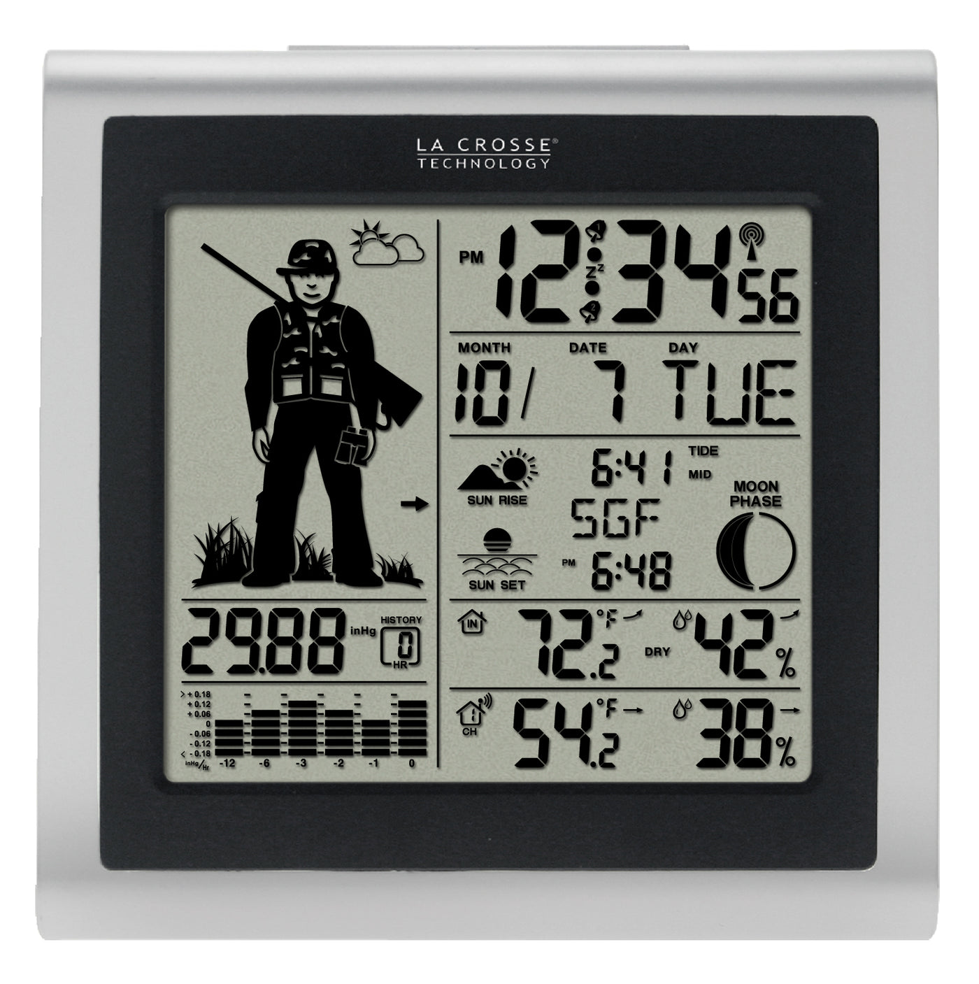 - Indoor/Outdoor temperature (°F/°C) and humidity (% RH) with MIN/MAX records