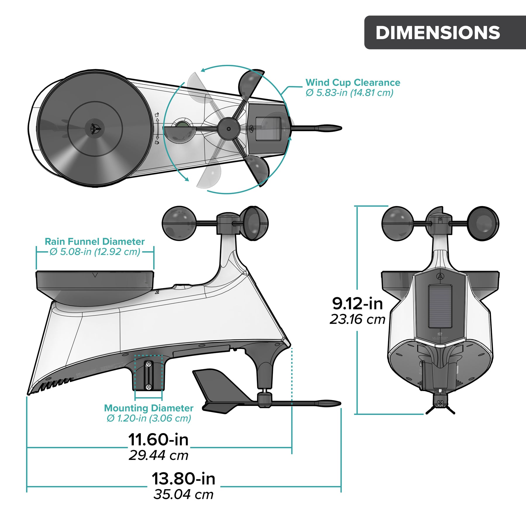 - 13.80" L x 5.18" W x 17.44" H with bracket; 13.80" L x 5.18" W x 12.47" H without bracket